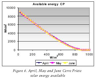 There is a weather station in the geothermoelectric field of Cerro Prieto; in this field has been in stalled a rotating shadowband pyranometer which measures global and diffuse irradiance. The direct irradiance data is calculated by the same device, so that it is counted based on data from 2000 to 2003. With these data averages, a yearly average was obtained hourly for every day of the year, since the station makes measure ments every 15 minutes. Four data were used to make the hourly averages for every day of the year, which were divided equally as well with their corresponding year, with four years used to make the hourly average.