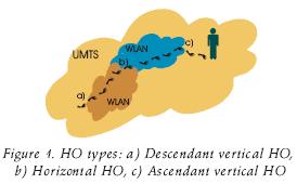 The vertical HO is divided in two categories: an ascendant vertical HO defined as a HO from a WLAN towards a wireless network with larger cell size whose coverage includes the WLAN, and a descendant vertical HO defined as a HO towards a wireless network with smaller cell size. To illustrate this procedure, figure 1 shows a person walking with a mobile terminal while connected to the Internet. As the terminal moves inside the hybrid network, several HOs must take place: starting at point a), the terminal passes from UMTS to a WLAN, this corresponds to a descendant vertical HO; point b) indicates the HO between two WLANs, called horizontal HO; point c) illustrates an ascendant vertical HO.