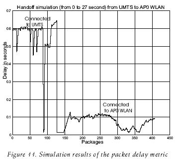 The packets that went through the UMTS BS, when the MN was connected to that agent, are the most delayed. Since the WLANs effective bit rate is larger than that of UMTS, it was found in the simulations that the packets suffer less delay when transmitted through the WLAN APs.