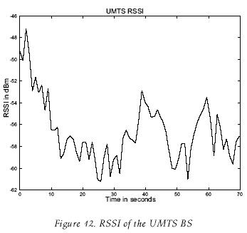 The received signal strength from the UMTS BS and the WLAN AP0 are shown in figure 12 and figure 13, respectively. Figure 14 shows the results of the RSSI that the MN measures from the UMTS BS; this information is presented as a function of the distance between the BS and the MN. An overlap is observed in (i.e. between distances 64 and 70 meters), this is due to the fact that the MN reaches a maximum distance at around 69 mts. and then it begins to come back closer to the UMTS BS.