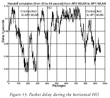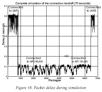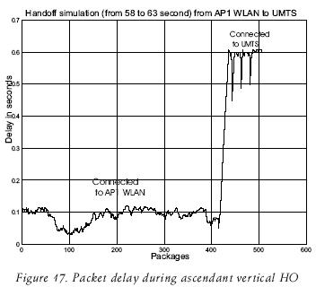 The packet end to end delay (i.e. CN to MN) is shown in figure 17; these results were obtained some seconds before and after the HO from the second AP WLAN to UMTS. Table 4 shows the HO delay measured from the time the HO is triggered to the time when the MN is connected to the UMTS again.