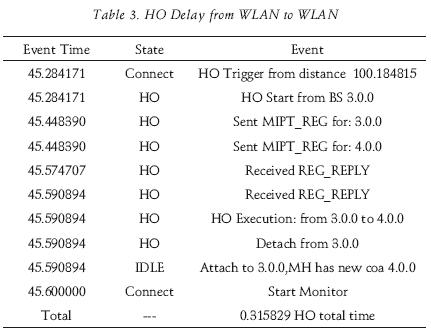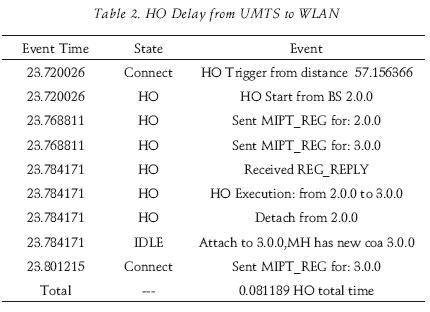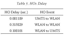 Table 5 shows the measured delays during the HOs. It can be observed that the HO delay is larger between WLANs, where it was expected to be smaller, but this delay is random and is due to the Dwell and Link timers employed. This can be con firmed by observing the delay between "HO Start" and the first "Sent MIPT_REG" in table 2, table 3 and table 4, which are equivalent to 0.048785, 0.164219 and 0.009106 sec. respectively. The use of timers can be considered as a problem that reduces the efficiency, but is necessary to avoid the "pingpong" ef fect.