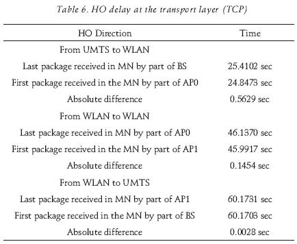 Table 6 shows the HO delay at the transport layer (TCP). It is observed that the MN can receive packets from two connections at the same time; this happens when the MN (during a HO) is be ginning to receive packets from the new agent while there are pending packets (from the old agent) still on the air or cable. The "Detach" operation de noted in table 2, table 3 and table 4, does not imply disabling the interface, and the MN can still receive packets from the previous BS or AP.