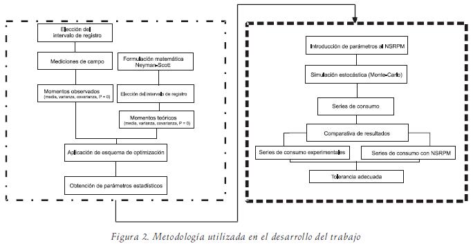 En la realización del proceso de desagregación se abordan diferentes etapas como el análisis de datos, formulación del modelo propuesto, estimación de parámetros y su validación (figura 2). Dentro de la estimación de parámetros se considera una técnica de optimización que emplea dos tipos de momentos: teóricos y observados. Los momentos observados se calculan a partir de los registros de consumo en campo.