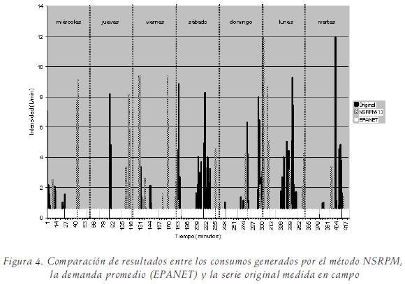 Actualmente en los modelos de simulación de redes de distribución de agua comerciales (WATERCAD®, Info Works®, etc) o de dominio público (EPANET), las de mandas se asignan por medio de valores constantes ó por un patrón con la variación horaria durante el día para el caso de simulaciones con periodos extendidos. Esta situación es poco realista a nivel de toma domiciliaria, dado que el consumo se expresa mediante pulsos instantáneos de duración corta. En la figura 4 se realiza una comparación entre el consumo promediado e introducido posteriormente al programa EPANET (0.572 L/min) la variación del consumo doméstico medida en campo y la serie generada a partir de las simulaciones realizadas a través del modelo NSRPM.