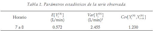 Con el objetivo de demostrar la metodología planteada se tomaron los registros de cada minuto durante siete días en una casa habitación. Cabe aclarar que el esquema de NeymanScott es estadísticamente estacionario en el tiempo, lo que obliga, por lo tanto, a aplicar el modelo en lapsos de tiempo concretos y no a lo largo de todo el día. Lo anterior se debe a que el proceso diario de consumo de agua para una vivienda dada, sigue patrones temporales claramente no estacionarios, con probabilidades de eventos distintas entre unas horas y otras. Por lo anterior, se seleccionó la medición en una casa habitación de la zona "Humaya" en el horario de 7 a 8 de la mañana, debido a que presenta una actividad elevada en los consumos de las casas monitoreadas. La metodología posteriormente se aplicó a las nueve casas habitación restantes, todas ellas con el fin de realizar un análisis comparativo considerando el mismo horario, esto es de 7 a 8 de la mañana. Posteriormente se obtienen los momentos observados que se componen de la media, varianza y covarianza de los registros selecciona dos en este horario. En la tabla 2 se presentan sus parámetros estadísticos.