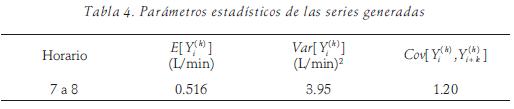 Una vez obtenidos los cinco parámetros necesarios, λ, µx, µc, η, β además del caudal promedio, se realizan las simulaciones para generar series de consumo empleando el modelo NSRPM. Recordar que el intervalo analizado es de siete horas (420 minutos), que es equivalente a la medición realizada de una hora, en cada uno de los siete días de la semana analizados.