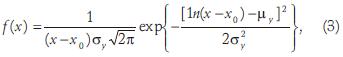 where xo, µy and σy are the location, scale and shape parameters. This distribution is not bounded in the lower or upper tail.