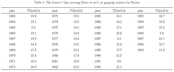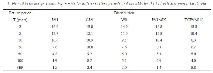 In order to do an integral assessment of the environmental impact associated with the hydroelectric project, it is necessary to account with an estimate of the possible ecological flow of the river. According to the one of the aquatic life criteria proposed by the United States Environmental Protection Agency (EPA, 2006), the hydrologicallybased design flow 7Q10 is obtained by using the lo west 7day average flows computed through the gauged data at station La Parota (table 3). The EV1, GEV, W3, and mixed distributions were used to fit the sample. The corresponding SEFj and the design events for different return periods are shown in table 4. By considering the criterion of the minimum stan dard error of fit and from an hydrological point of view, the EV1MIX distribution was selected, and the low flow 7Q10 = 10.4 m3/s would be the minimum condition to maintain the water quality and the aquatic life downstream of the dam.