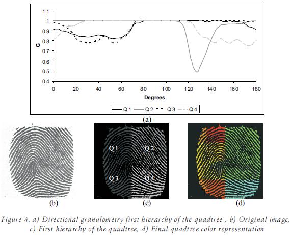 Now the application of the quad tree is presented briefly for right loop, worth loop and arch loop classes fingerprints. By as su ming a size of 60 on the granulometric distribution function illustrated in Figure 4a; the minima of this function enable us to take the decision to stop the split procedure of the quadtree approach or to continue the procedure by splitting the square region. The curve in figure 4a computed from the square region Q2 has the most notable minimum, that in fact characterize the main directional structure (the biggest one) contained in the image. In other words, the principal directional structure in the fingerprint is computed at the first hierarchy of the quadtree Q2. In this example, the structural information given by this region of the fingerprint enables us to classify it as a left loop. Figure 4d shows the out put image containing the final result of the segmenting process. Observe that the granulometric function illustrated in figure 4a of the squared region Q4, that con tains small variations with several minima is correctly segmented. In this case a second hierarchy level is required to achieve the segmentation of the region. Thus, the global behavior at the first hierarchy of the quad tree structure per mits to ex tract the characteristics to classify the fingerprints. This coarser to finer approach inherent in the quad tree permits to better understand the directional structures at each level of the hierarchy based on the granulometric functions.