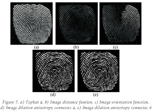 The second method considers a local approach by using the concept of distance function which is computed by the supremum of directional erosions. Thus, the maxima of the distance function contain the information of the biggest structural elements or line segment that can be placed inside the structure. In order to know the orientations, a second image is computed by detecting the orientation of the supremum of directional erosions. The se local descriptors for the size and orientation provide an excellent reconstruction of the orientations and allow describing the model of the fingerprint orientation pattern in a piecewise manner. The main advantage of this is algorithm is that it is able to predict orientation in a more efficiently way because the proposed approach does not need to determine the core or delta of the fingerprint.