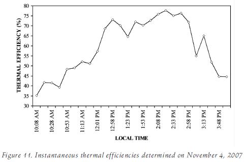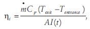 To gain insight into the approximate thermal efficiency of our solar collector under typical operating conditions, we calculated instantaneous efficiencies according to the formalism given by Tiwari (2002a), whose equation 3. 43b reads: