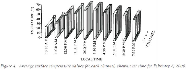 The metal surface temperature of 66°C measured in this experiment at the highest measurement points along channels 1, 6 and 10 is just slightly higher than the temperature of 62°C measured for the exiting water at the same point in time (figure 3 for a time of 14:30 PM), which evidences the good thermal contact be tween metallic channel and the flow ing water which is achieved with the present simple design. In contrast, with plateandtubearrays, Shitzer et al. (1979) have observed differences of 20°C and more be tween the surface temperature at the center line of the plate be tween adjacent tubes and the water temperature inside the tubes, which they as cribed to poor thermal bonds be tween plate and tube.