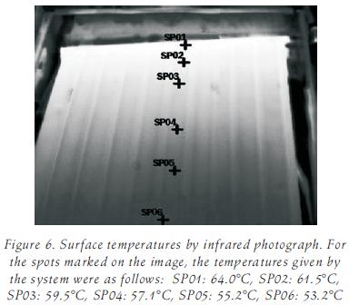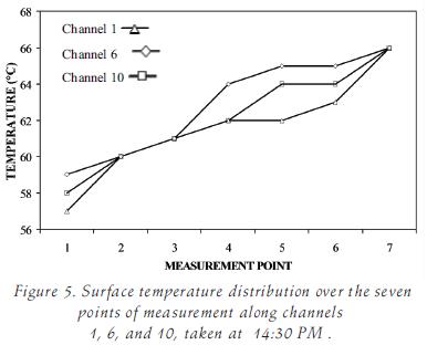 To indicate the typical outer surface temperature distribution along a given channel, figure 5 shows the temperature values for seven points each, in the left most and in the rightmost channel of the collecting panel, as well as in the central channel, all at 14:30 PM on February 6, 2006.