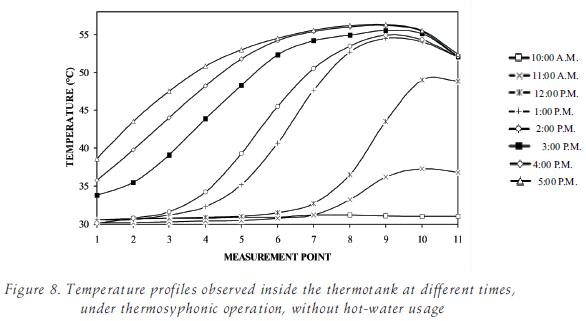 Water temperature distributions obtained inside the thermotank un der thermosyphonic flow condictions were determined by direct measurement. The temperature profiles shown in figure 8 at test to a continuous increase in tank water temperature throughout the hours of insolation. The layering of temperatures in the tank, a precondition for efficient use of the hot water, is also evident.