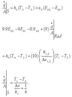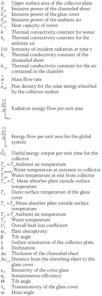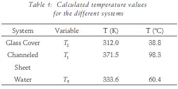 The particular values for the various parameters used in our evaluation were: 494.5 W/m2 for the radiation density, 20 W/m2 °C for the thermal convectivity constant for ambient air, h3; 14°C for the ambient air temperature, T3 or Tα; 0.90 for the emissivity of the cover glass, s2; 384.6 W/m2 for the emissive power of the ambient air, Eb3, calculated from the StefanBoltzmann constant a nd T3; 0.030 W/m °C for the thermal conductivity constant for the air in the chamber, k1,2; 0.20 m for the distance from the absorbing surface to the glass cover, Δxi2; 60.9 W/m °C for the thermal conductivity constant for the channeled sheet, ke; 1.0 mm for the thickness of the channeled sheet, Ax; 10 W/m2 °C for the thermal convectivity con stant for water, h. Solving equations 1, 2, and 3 by the it er a tive method given by Holman (2001) we obtain the temperature values listed in table 1.