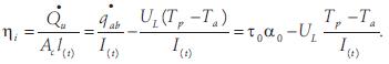 Here, I(t) is the instantaneous irradiance on the collector plate, and Tp and Ta are the collec tor surface temperature and ambient air temperature, respectively. The simple equation given above was considered sufficient for our purpose of obtaining rough estimates for the thermal efficiency that could be expected. Thus, we did not use more complicated equations that contain higherpower terms of the (Tp Ta) difference (e.g. Fischer et al., 2004), as the prevailing conditions in central Mexico en tail very low wind speeds. Also, we disregarded the possible incidenceangle dependence of the zeroloss efficiency, as we were interested mainly in the thermal efficiency during the hours around noon, when the direction of incident radiation is reasonably close to normal relative to the receiving surface, and it is known that the loss of solar absorptance of flat black surfaces is minimal for incidence angles of up to 50° rela tive to the nor mal (Duffie and Beckman, 1991).