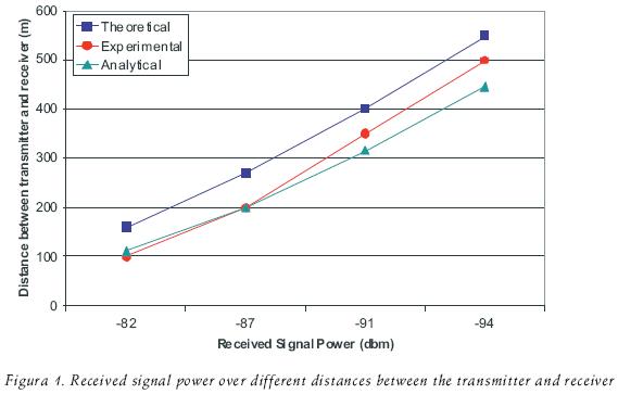Figure 1 provides the theoretical, experimental and analytical results of the received signal power over different distances between the transmitter and receiver. The values theoretically expressed are the values shown for Enterasys Wireless cards. On the other hand, the values obtained experimentally correlated well with those used to obtain the analytical results. The maximum experimental distance between the transmitter and the receiver with 802.11b Enterasys Wireless cards and 5 dBi carmounted omnidirectional antennas is 446 m and a data throughput of 1 Mb/s.