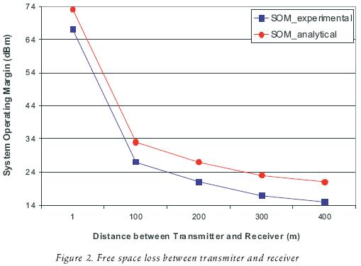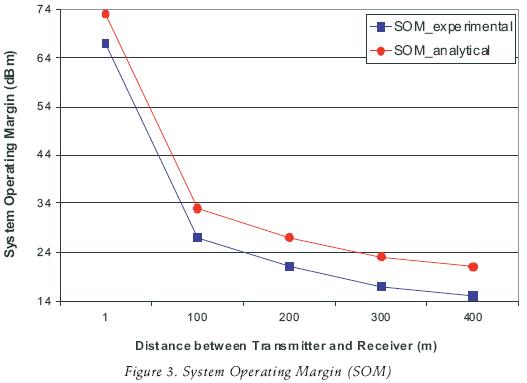The following experiment focused on determining the System Operating Margin between transmitter and receiver (figure 3). The analytical results are achieved using equation 6. Experimental results show good System Operating Margin values between the transmitter and the receiver at a distance of 300 m. and a SOMof 17dBm.
