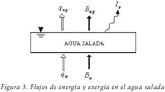 Esta es la relación de entrada de exergía desde el colector utilizada para calentar el agua salada y la exergía incidente del sol absorbida por el colector, εcolBs. Para el agua salada (figura 3), podemos también expresar una eficiencia de segunda ley, como se muestra: