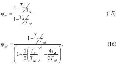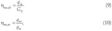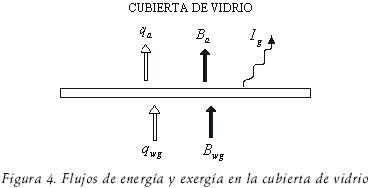 Las ecuaciones (5) y (6) son los balances de energía y exergía para el agua salada, donde qwg y Bwg son el calor y la exergía total, respectivamente, transferidos por convección, evaporación y radiación desde la superficie libre hasta el interior del vidrio. Los balances de energía y exergía en la cubierta de vidrio se presentan en las ecs. (7) y (8), respectivamente, donde qa es el calor transferido por convección forzada y radiación hacia el medio ambiente y Ba la exergía asociada a qa. En las ecuaciones (6) y (8), Iw y Icol son las irreversibilidades en el agua salada y en el colector. Los flujos de exergía, que no son transportados por radiación, se calculan usando la ecuación (2). Los flujos de exergía de radiación se calculan según la ecuación (1). Para los cálculos de exergía térmica se toma como temperatura de referencia la temperatura del medio ambiente Ta. Los flujos de calor calcularon según las conocidas relaciones de Dunkle (Malik et al. 1982). Con esta información podemos definir las eficiencias energéticas (de primera ley) y de exergía (de segunda ley) para el colector y el agua salada.