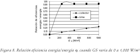 Para el agua salada, con un valor reducido de irradiancia solar, φ posee valores cercanos a la unidad, lo cual muestra que casi no existen irreversibilidades en el proceso de transporte de calor entre el colector y el agua, es decir, la calidad en el mecanismo de transporte se aprovecha casi al 100%. Podemos decir que, no existiendo pérdidas de calor en el colector, el sistema colectorevaporador es altamente eficiente.