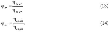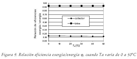 La relación de eficiencias exergía/energía para el colector y para el agua salada, respectivamente, se definen según: