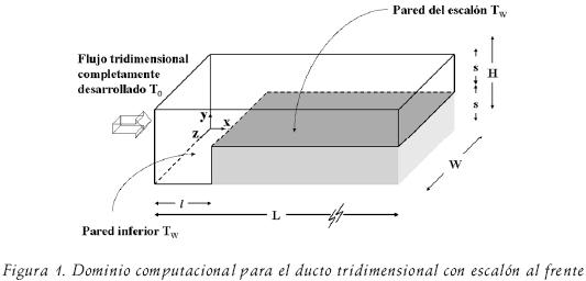 La orilla del escalón se localiza veinte veces la altura del mismo corriente abajo de la entrada del conducto (l=20s), mientras que la longitud del conducto en la dirección principal del flujo es de sesenta veces la altura del escalón (L=60s). Un esquema de la geometría propuesta se presenta en la figura 1.