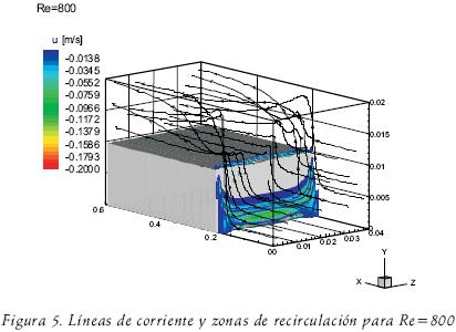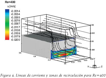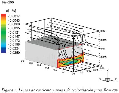 Para dar más detalle de las estructuras de flujo en el fenómeno a estudiar, en las figuras 3, 4 y 5 se muestran las líneas de corriente y las zonas en la cuales la componente principal del flujo presenta valores negativos para Re=200, 400 y 800, respectivamente. Las figuras antes mencionadas presentan claramente el salto hidráulico del fluido en la orilla del escalón. El fenómeno se hace más evidente cuando el Reynolds se incrementa. Posterior a este punto las líneas de corriente muestran que el flujo continúa su desarrollo hacia la salida del conducto. Especial atención requiere la figura 5 para Re=800. En esta figura se observa que algunas líneas de corriente saltan sobre el escalón, pero su momento es tan grande que impactan la pared superior del ducto y posteriormente se mueven hacia la pared horizontal del escalón para reunirse con el flujo y desplazarse a la salida del conducto en la zona horizontal adyacente a la pared del escalón. Si se compara con el comportamiento para Re=400 y Re=200, se observa que las líneas de corriente saltan el escalón y permanecen adyacentes a la pared superior y se conservan en esta zona hasta la salida del conducto. La diferencia entre tales comportamientos se asocia al mayor momento que presentan el flujo con mayor Reynolds.
