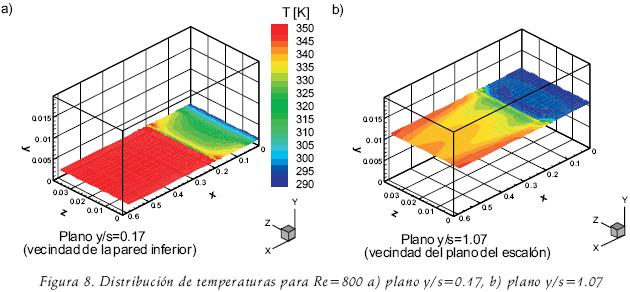 La tendencia de la distribución de temperaturas para el plano adyacente a la pared inferior es similar para Re=400 y Re=800 a la comentada para Re=200 en el párrafo anterior. Sin embargo, para Re=800 (figura 8) se observa que entre la orilla del escalón (x=0.2) y una franja de temperatura alta (zona amarilla T