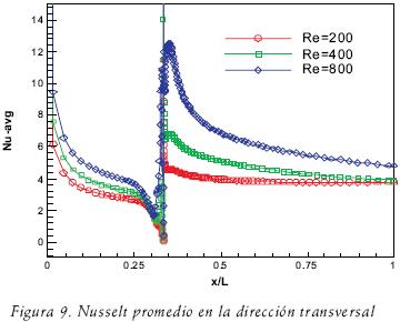 Finalmente, en la figura 9 se muestra la distribución del número de Nusselt promediado sobre la dirección transversal para diferentes posiciones en la dirección axial. Se observa que la tendencia de la distribución es muy similar para cada caso estudiado, teniéndose los valores más elevados para los mayores números de Reynolds. A la entrada del conducto, la distribución se comporta como una distribución clásica de problema de flujo con transferencia de calor en un conducto.
