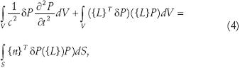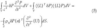 Los elementos matriciales se encuentran al discretizar la ecuación de onda (1), utilizando el procedimiento de Galerkin (Zienkiewicz et al., 2000). Multiplicando la ecuación (1) por un cambio virtual en la presión {δP} e integrando sobre el volumen (V) de dominio, se obtiene