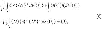 La ecuación (5) contiene la presión del fluido (P) y las componentes del desplazamiento mediante el vector {U} que son las variables a encontrar. Las funciones de forma de los elementos finitos para la variación espacial de la presión y las componentes del desplazamiento están dadas por: P ={N}T{Pe} y U = {N'}T{Ue}. Si se aplica la segunda derivada con respecto al tiempo a las funciones de forma para sustituirlas en la ecuación (5) y si [B] ={L}{N}T y ∂P ={N}TPe}, entonces la ecuación (5) simplificada se puede expresar como