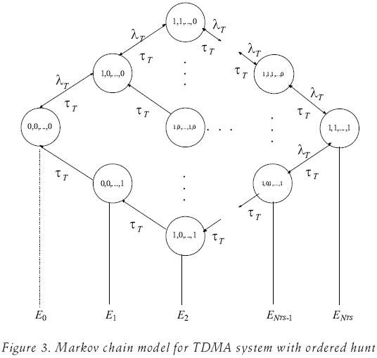 For the ordered hunt scheme we assume that the TDMA slots are numbered 1, 2,...,NTS in a way that cochannel slots are placed at the end of the list, and each incoming user takes the lowestnumbered idle slot. Thus, we can model the slot occupancy as a Markov chain with 2NTS states, as we can see in figure 3, wherein the general macrostate Eu represents the number of busy slots in the system, for u=0,...,NTS. The microstates of the form (0,0,...,0) represent all the possible positions of occupancy of u slots. Then for u=0, the state (0,0,...,0) represents the nonoccupancy of the slots. For u=1 the states (1,0,...,0) to (0,0,...,1) models the occupancy of one slot, from the first position to the final position. We follow in this way until the value, u=NTS, for which the state (1,1,...,1) models the occupancy of all the slots. In general, each Eu is integrated by a group
