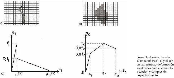 En los cálculos de δ y Pg con las ecuaciones anteriores, se supone que el concreto no está agrietado. Una vez que los óxidos continúan creciendo, esto es, a mayores valores de δ, entonces el concreto se agrieta; sin embargo, aún agrietado se supone que posee alguna resistencia adicional a tensión. Este proceso será modelado con elemento finito mediante el paquete ANSYS, donde el proceso de agrietamiento será bajo el concepto de smeared crack, esto es, en lugar de suponer grietas discretas, se propone modificar las propiedades mecánicas del concreto de acuerdo a relaciones esfuerzodeformación dadas para éste. La figura 3 muestra el concepto de smeared crack y las relaciones esfuerzodeformación para el concreto, tanto a tensión como a compresión. La nomenclatura de la figura 3c corresponde a la de ANSYS, donde Tc es un factor que toma en cuenta la relajación del esfuerzo. Para el trabajo desarrollado aquí, se da un valor de 0.9. Tanto el valor de Tc como la curva de la figura 3d, fueron adoptados de un trabajo previo (Castorena et al., 2005) ya que con estos valores se resuelve el problema de convergencia. SOLID65 es el único elemento finito en ANSYS capaz de simular agrietamiento a tensión y aplastamiento a compresión en el concreto, consta de ocho nudos y tres grados de libertad en cada uno: desplazamientos lineales en direcciones x , y y z. Para el caso de modelar con elemento finito la capa de óxido en la interfase aceroconcreto, se utiliza el elemento de contacto CONTA173. Este elemento consta de cuatro nudos y se utiliza para representar el contacto y deslizamiento entre dos superficies rígidas y una deformable; las superficies rígidas corresponden al acero y concreto, la superficie deformable es la que se define por el elemento CONTA173. El acero de refuerzo es modelado como SOLID45, que al igual que SOLID65 es un elemento tridimensional con ocho nudos y tres grados de libertad, pero sin tomar en cuenta agrietamiento.