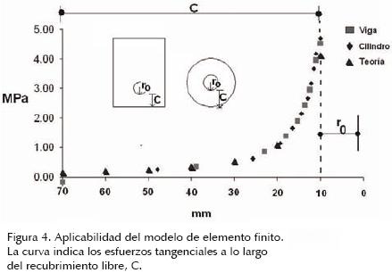 En la figura 4 se dan los resultados obtenidos para una sección transversal cilíndrica y otra rectangular, a la que se denomina viga, a efecto de mostrar que la ecuación 1 también puede ser utilizada para secciones rectangulares. Los datos para la obtención de los valores de las figuras 5y6 son: radio del refuerzo, r0 = 10.0 mm, recubrimiento libre C = 60 mm, módulo de elasticidad del concreto Eh = 32390 MPa, módulo de elasticidad para el acero Ea =205000 MPa, módulo de Poisson del acero va = 0.3 y del concreto vh = 0.24. Los datos anteriores son ficticios y la importancia de los resultados mostrados en la figura 4 radica, para el presente trabajo, en que se utilizarán cilindros en la modelación con elemento finito para el cálculo de la presión en la interfase aceroconcreto, por la simplicidad y además por las consideraciones de simetría.