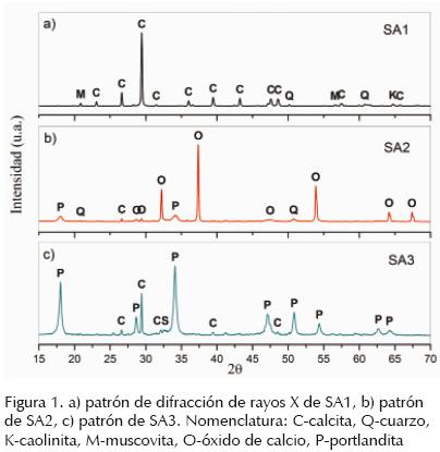 Finalmente, la figura 1c muestra el patrón de difracción de SA3, que corresponde a hidróxido de calcio. Nuevamente, este patrón permite observar los cambios químicos y cristalográficos en la evolución del ciclo de la cal: luego de la hidratación del óxido de calcio, la cual se produce por medio de una violenta reacción química exotérmica, se generan los cristales de portlandita (Ca(OH)2) con estructura hexagonal. En el patrón, también se registraron señales correspondientes a cristales de calcita, los cuales son el remanente de la materia prima empleada, cristales de cuarzo (SiO2) en baja cantidad, según la intensidad de sus señales y cristales de silicato de cuarzo (Ca2(SiO4)) (PDF 860398) y anhidrita (Ca(SO4)) (PDF 371496); esta última posiblemente originada por el azufre proveniente del combustible, el cual al entrar en contacto con el agua de la hidratación reacciona para formar óxido de azufre (SO2) y éstos posteriormente reaccionan con el carbonato de calcio para formar la anhidrita. De acuerdo con estos resultados, las fases minerales pueden variar de muestra a muestra desde su origen en la cantera; por esta razón, una semicuantificación de estas fases tendría poco sentido.