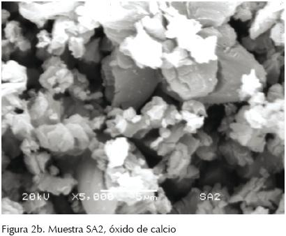 La muestra SA2 presenta partículas pequeñas con una distribución amplia de tamaños de partículas, la cual va desde la escala nanométrica (800 nm) hasta el orden de decenas de micrómetros (20 μm). En este material se llevó a cabo un proceso de molienda sin efectuar un filtrado por tamiz y la calcinación para transformar la calcita a óxido de calcio. Los bordes de las partículas están bien definidos, pero no tienen una forma en particular; su morfología es básicamente un remanente de aquella que presentaba la calcita antes de la calcinación. En la muestra SA3 se encontraron partículas más pequeñas. La distribución de tamaños para esta muestra también es muy amplia, pero predominan los tamaños pequeños en el orden de los 300 a los 60 nm, aunque fue posible observar partículas de hasta 15 μm.