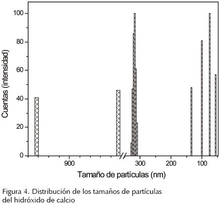 La distribución de tamaños de partículas del hidróxido de calcio (muestra SA3) se determinó mediante un equipo de dispersión dinámica de luz Brookhaven Instruments (USA) modelo BIAPD que utiliza un láser rojo con longitud de onda de 632.8 nm a un ángulo de 90°, tiempo de retraso 5|js, temperatura ambiente 23°C y dilución en agua bidestilada; programa de análisis cumulantes non negative list square. La primera medición se hizo inmediatamente luego de una agitación vigorosa; la segunda a los 15 min y una tercera después de media hora.