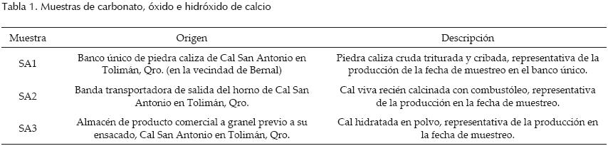 Se estudiaron tres muestras identificadas como sigue: SA1corresponde a CaCO3, SA2 a CaO, y SA3 a Ca(OH)2. La muestra SA1 fue obtenida en una cantera de piedra caliza luego de trazar una retícula, recolectando tres muestras de aproximadamente 250 g de doce posiciones aleatorias en casillas de la retícula, mismas que se mezclaron y dividieron por cuartos hasta obtener una muestra representativa de la totalidad. La muestra SA2 (cal viva) fue obtenida en la boca del horno de calcinación, siguiendo un procedimiento de muestreo equivalente al empleado para la obtención de SA1. Finalmente, la muestra SA3 se obtuvo en la boca de salida del equipo de hidratación de una empresa fabricante de cal, con muestreo semejante al citado. Las muestras se aislaron del ambiente para su conservación.