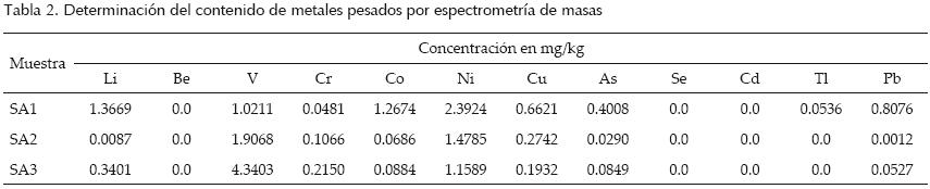 En las muestras se analizaron concentraciones de varios elementos potencialmente peligrosos para la salud y algunos isótopos. El equipo permite detectar concentraciones de hasta partes por trillón. Luego del análisis por espectrometría de masas para evaluar metales pesados, se encontró que las tres muestras analizadas en este estudio contienen elementos químicos peligrosos que no significan riesgos de acuerdo con las normas, tanto nacionales como internacionales, cuya consideración aporta una mejor visión del horizonte de análisis; los resultados se muestran en la tabla 2. La presencia de los elementos detectados mediante ICPMS en las muestras, no tiene mayor efecto para el uso de la cal en la construcción porque su concentración es prácticamente imperceptible. No obstante, es interesante matizar el contenido de metales pesados y otras substancias peligrosas porque la cal hidratada, aunque fabricada primordialmente para su uso en la construcción, se utiliza también ampliamente en el proceso de nixtamalización del maíz; de acuerdo con datos de la ANFACAL, se usan en el orden de 100,000 toneladas anualmente para nixtamalización; luego de verificar la Norma Oficial Mexicana NOM 187SSA1/SCSI2002 relativa a masa, tortillas, tostadas y harinas preparadas para su elaboración, las muestras analizadas se encuentran dentro de los límites en contenido de metales pesados y otros elementos peligrosos, aceptables para consumo humano, ello a pesar del uso de combustóleo para la calcinación y de agua sin control sanitario para la hidratación.