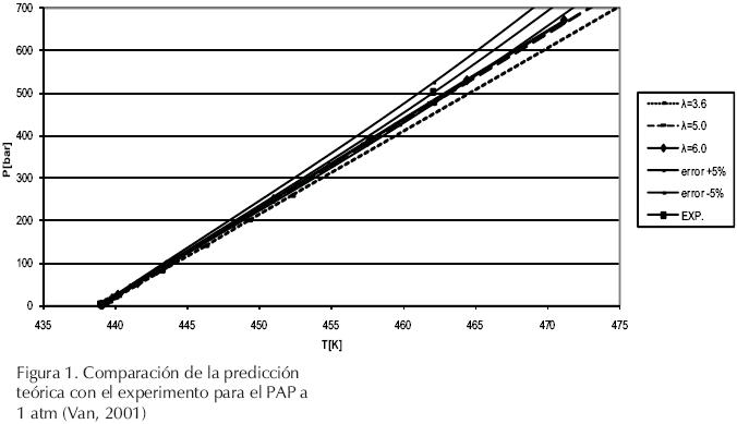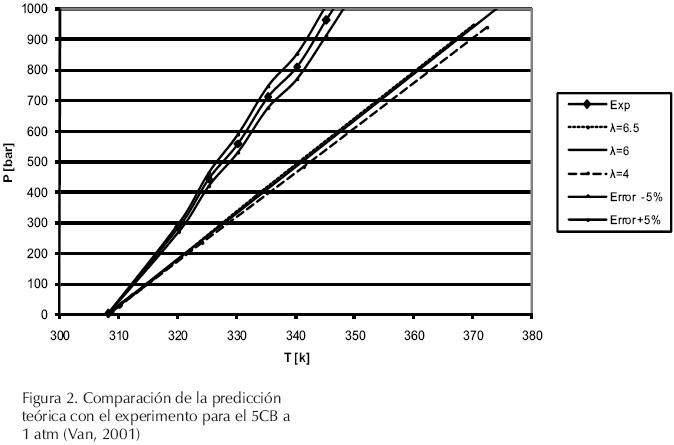 Siguiendo la metodología propuesta por García et al. (2002) para efectuar la comparación teórica con el comportamiento experimental presión contra temperatura para la transición IN a 1 atmósfera de presión para los cristales líquidos PAP, 5CB, MBBA y EBBA (Van, 2001), en este trabajo se encontró lo siguiente, en la figura 1 se muestran los resultados de la comparación para el PAP a 1 atm (en esta figura y en las siguientes, se consideró mostrar en ellas un margen de error de 5% para el comportamiento experimental), como se puede observar, al efectuar el análisis del efecto del alcance del potencial en la predicción, se encontró que la mejor predicción se tiene para el valor más alto, que es 6.0, en comparación con 3.6 y 5.0.