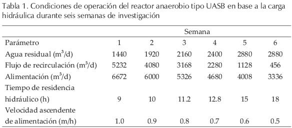Las dimensiones del reactor anaerobio fueron de 9 m, 16 m y 17.38 m de alto, ancho y largo respectivamente, con un área de 278 m2 (proyección en planta) y un volumen de 2,500 m3. El reactor se diseñó para tratar 5,000 m3/d de agua residual industrial, con una carga en términos de DQO de 6,000 mg/L, con las siguientes condiciones de operación: 6,672 m3/d (278 m3/h) de flujo total de alimentación (flujo de agua residual + recirculación). 3,000 m3/d (125 m3/h), de agua residual industrial promedio con una tasa de recirculación del 122%. Al arranque de la operación del reactor, éste se inoculó con 11,000 kg de biomasa. La alimentación al reactor con el agua residual industrial estuvo determinada por la relación sustrato: microorganismos, la cual se trató de mantener siempre por debajo de 1.0 kg DQO/kgSSV. El reactor operó a una temperatura promedio de 35°C (dado que el agua residual sale caliente de la fábrica). La tabla 1 presenta las condiciones hidráulicas de operación del reactor anaerobio para cada semana en la que se cambiaron las condiciones de trabajo, sobre todo las del flujo ascendente de alimentación que varió desde 1 m/h en la primer semana a 0.5 m/h en la sexta semana (1.0, 0.9, 0.8, 0.7, 0.6 y 0.5 m/h para la primera, segunda, tercera, cuarta, quinta y sexta semana, respectivamente. Los flujos se ajustaron cerrando o castigando la válvula alimentadora). Con un equipo automático y refrigerado de lunes a viernes, se tomaron del afluente y del efluente muestras compuestas de 24 horas durante el tiempo de experimentación (sin muestreo sábados y domingos). Las muestras compuestas consistentes de 6 L, se formaron de la toma de 0.5 L de muestra cada dos horas durante 24 horas. Las muestras se analizaron diariamente para determinar los parámetros y cálculos de desempeño del reactor. Los resultados se registraron en los reportes de monitoreo.