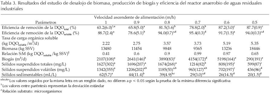Los resultados de la pérdida de biomasa (SSV), SST, producción de biogás y eficiencia de remoción en el reactor anaerobio en términos de la DQO total y soluble, se sometieron a un análisis de varianza para un análisis de experimentos unifactorial, seguido de un análisis de medias, mediante la prueba de la mínima diferencia significativa a p < 0.05 (Montgomery, 1991).