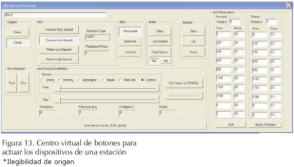 Un ejemplo de los diálogos que se diseñaron para el sistema, se presenta en la figura 13, el cual despliega un centro virtual de botones para activar manualmente los dispositivos que componen una estación. Este diálogo también permite configurar el perfil de velocidades del movimiento del pistón del brazo.