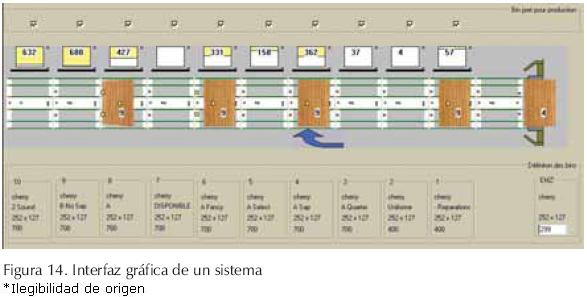 Por otra parte, se presenta en la figura 14, la interfaz gráfica que se despliega en la consola principal del sistema. Ésta permite visualizar interactivamente el desempeño del sistema y su estado actual. Se puede apreciar que en el instante mostrado, existen 4 hojas de madera de cerezo en tránsito, dirigiéndose a la estación nueve, la cual está recibiendo la calidad "B No Sap" y que cuenta ya con 680 hojas en la pila. Además, el operador acaba de ingresar una hoja de calidad "A Sap", la cual se dirige a la estación cuatro.