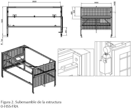 Como se indicó anteriormente, el diseño de todo el sistema debe ser modular, por lo que cada estación de apilamiento es independiente. No obstante, al unir los módulos se forma una sola línea, en particular, la primera línea que se puso en marcha es de diez estaciones. El subensamble de la estructura que soporta cada módulo se denomina 0HSSFRA y la figura 2 muestra tres vistas con dimensiones globales en mm. También se pueden observar detalles de las bisagras de las puertas de acceso en las que se integra un interruptor de seguridad para detener la línea por seguridad, en caso de que un operador intentara abrir la puerta inferior.