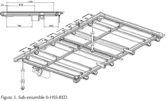 El transportador de banda, cuyo subensamble se especifica como 0HSSBED, tiene dos funciones: como transportador cuando se encuentra en posición horizontal, o bien, como alimentador de la estación contigua, cuando éste se inclina para entregar la hoja. Por ejemplo, si la hoja debe ser descargada en la octava estación, entonces los módulos del uno al siete se mantienen horizontales con sus bandas en movimiento y, cuando la hoja llega al séptimo módulo, éste se inclina y sus bandas se detienen cuando la hoja llega a la posición en que se sincroniza con el brazo del octavo módulo. En la figura 3, se muestran una vista lateral con dimensiones en milímetros y una vista isométrica que muestra el sistema de bandas por la parte inferior.