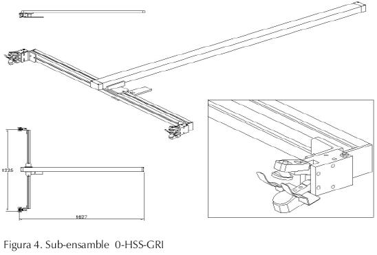 El subensamble 0HSSGRI0, denominado brazo sujetador, es el que tiene la función de tomar la hoja del alimentador y posicionarla en la base. Este sistema se desarrolla en la siguiente sección para presentar los conceptos que se aplican cuando se llega a la fase de detallar cada parte que contiene un subensamble. La figura 4 presenta varias vistas incluyendo un detalle de la pinza sujetadora.