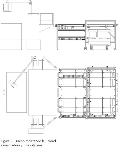 El ensamble general, en el que se presentan una estación y el alimentador principal, se ilustra en la figura 6. Es posible comparar esta última con el boceto que representa el concepto que se tomó como punto de partida (figura 1) y notar que algunos rasgos de las ideas principales quedan plasmadas en el resultado final.